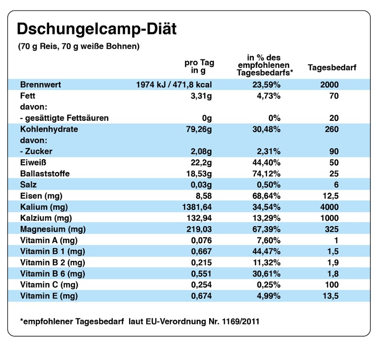 Auch wenn die Promis diesen Ernährungsplan wahrscheinlich niemals freiwillig durchziehen würden, haben sie im jährlichen Dschungelcamp keine andere Wahl Neben ein paar Insekten besteht die Hauptmahlzeit der Camper nämlich aus Reis und Bohnen Ungewollt führen die Dschungelbewohner daher eine ReisBohnenDiät durch Auf alkoholische. 70 Gramm Bohnen, 70 Gramm Reis – so sieht die DschungelDiät aus Um mehr zu bekommen, müssen die DschungelcampBewohner EkelPrüfungen über sich ergehen lassen. CrashDiät Dschungelcamp Allein in der vergangenen Staffel haben die Kandidaten zusammen Kilo abgenommen Der Spitzenreiter mit elf Kilos war damals "GZSZ"Star Felix van Deventer Einer der Gründe Gisele Oppermann wurde von den Zuschauern immer wieder in die Prüfungen gewählt und ließ eine nach der anderen sausen.