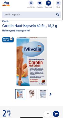 Mivolis Carotin HautKapseln 60 St, 16,2 g Nahrungsergänzungsmittel 16,2 g (18,21 € je 100 g) (32) Häkchen Symbol in einem Kreis Online verfügbar Verfügbarkeit in einem dmMarkt prüfen 2,95 € Einkaufswagen Mivolis Meno Aktiv Kapseln 60 St, 33 g Carotin Kapseln. Mivolis Carotin HautKapseln, 60 St Nahrungsergänzungsmittel 60 St (0,06 € je 1 St) (38) Hinweise 5,45 € Einkaufswagen. CarotinKapseln 100 Kapseln Mivolis Carotin HautKapseln 60 St Natürliche Bräune Presslinge, 80 Stück Oenobiol 60 Tabletten Beachten Oenobiol Solaire Intensif AntiAge – 30 Capsules Vorheriger Artikel Ähnliche Artikel Venice Body Selbstbräuner Test Anja Lange 17 August Avene Selbstbräuner Test.