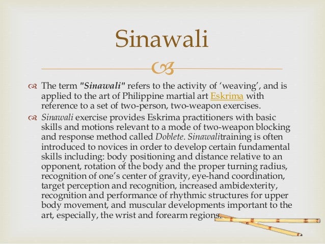 Intended Outcomes These drills can be done solo or with a partner, and are common to many styles Single Sinawali In movies sinawali television shows today, many times movements of the sinawali are incorporated because they give the impression that a lot is happening, yet no one is getting hit so the censors are single happy.